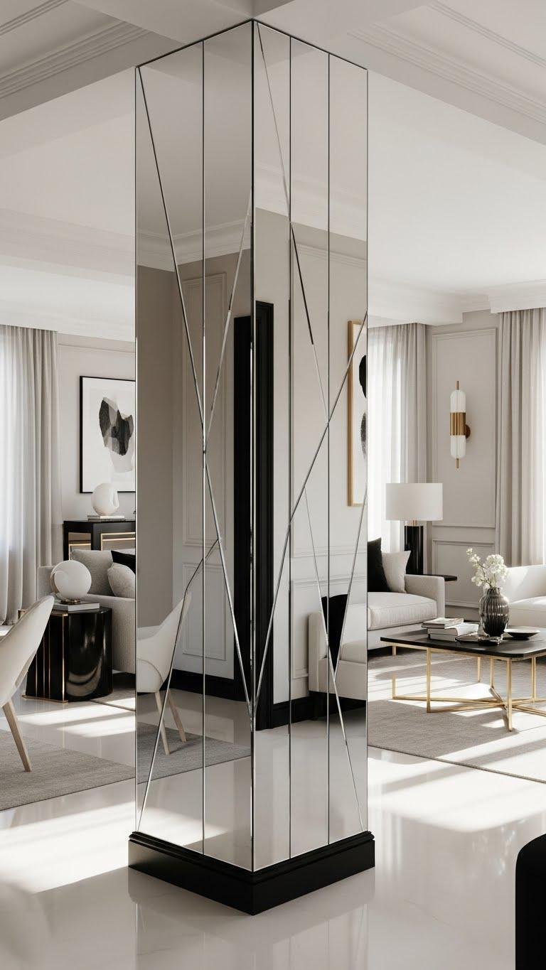You can wrap a reflective column with slim patterned mirror panels to create rhythm and depth, or pick geometric seams for an artful sculptural vibe. It frees sightlines, bounces light, and gives rooms an airy, bold edge.