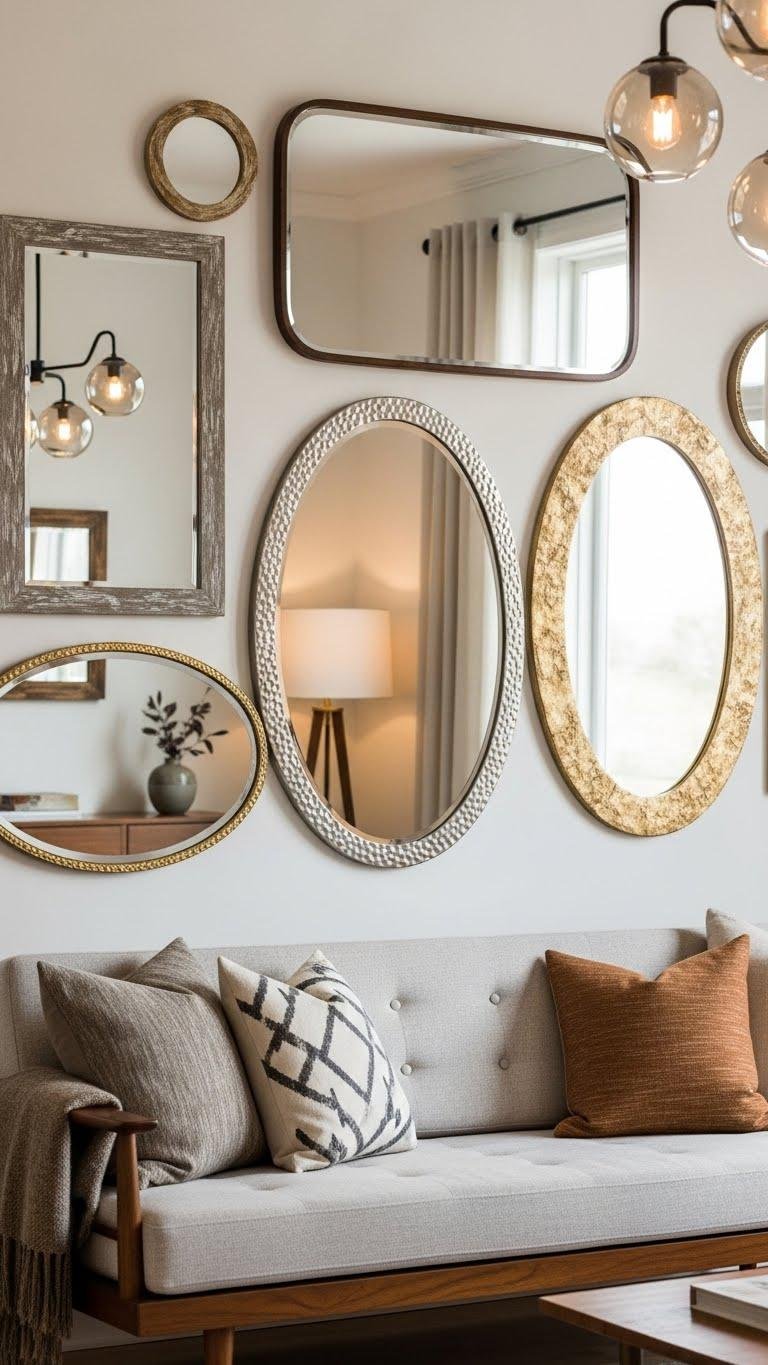 Layering mirrors behind a sofa instantly multiplies light and depth, turning a simple seating wall into a textured focal plane—you can overlap different shapes, sizes, and finishes to create a curated, gallery-like effect.
