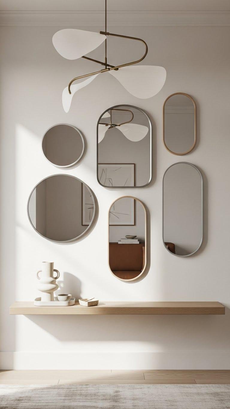 Pair a low-profile floating shelf with a gallery of mirrors, add sculptural statement lighting, and keep styling minimal. You’ll create airy, effortless arrival moments that feel freeing and modern.