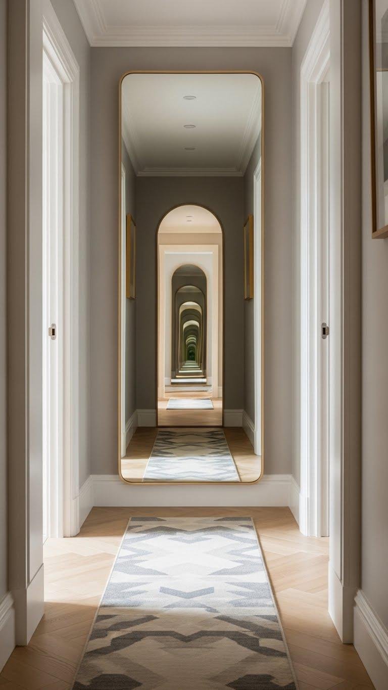 Placed at the far end of a corridor, a tall mirror instantly stretches the sightline and bounces light back through the hall, making even narrow passages feel open and intentional.