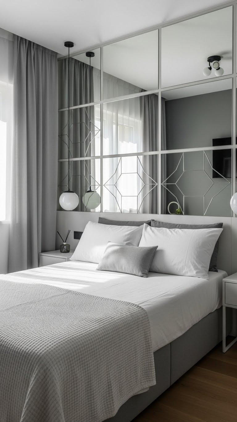 Often a mirrored headboard wall will instantly enlarge a small bedroom, doubling perceived depth and bouncing light where you need it most.