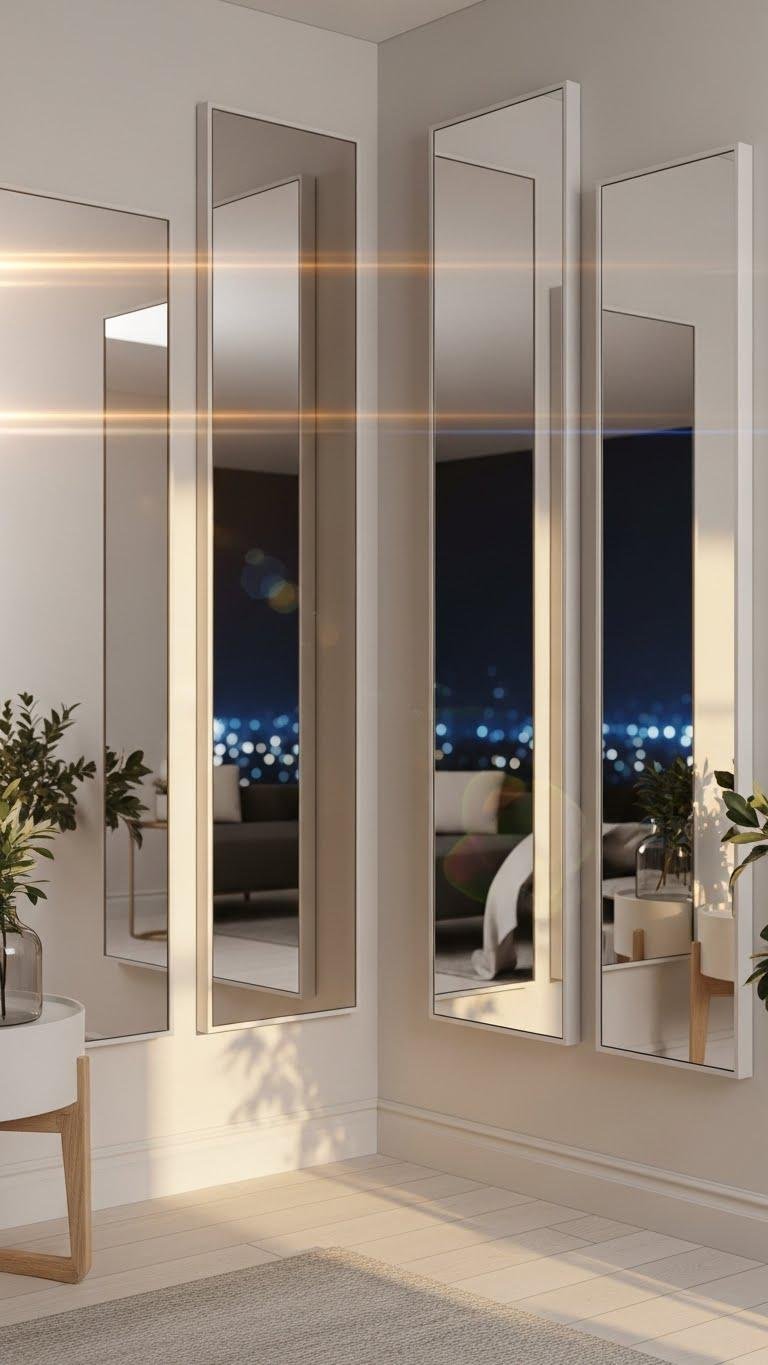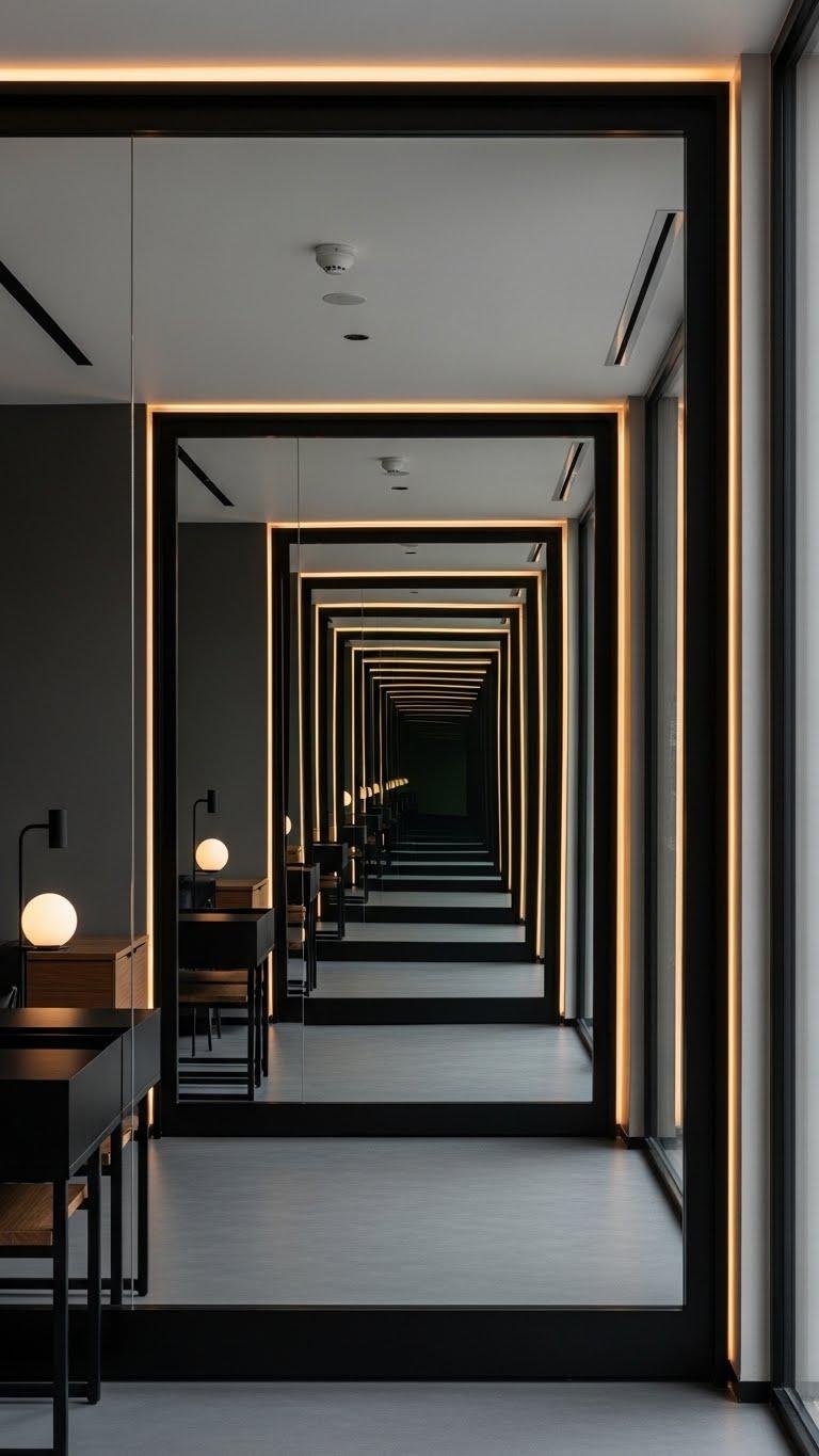 If you want to amplify depth and drama, a wall of mirrors creates an almost endless vista that tricks the eye and stretches any room. Place large, uninterrupted panes to form an infinite corridor effect; you’ll feel liberated by expansive sightlines. Reflective repetition of frames or panels intensifies movement and modern allure, so keep styling minimal, bold, and intentionally rhythmic for maximum visual freedom.