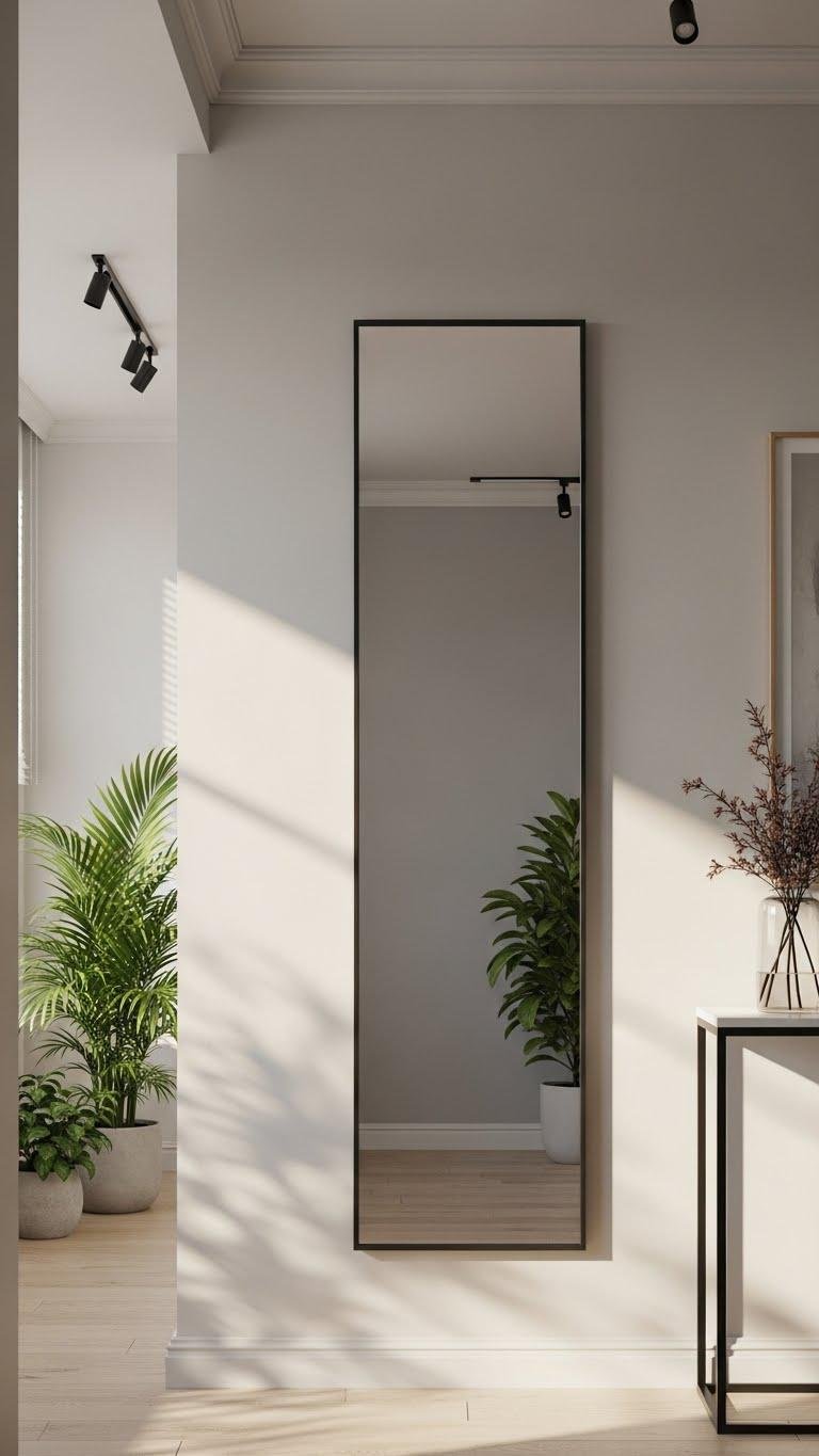 If you’ve got a narrow wall, hang a full-length mirror to instantly broaden the sightline and double natural light; positioned vertically it stretches the wall while a slim frame keeps the look modern and minimal.