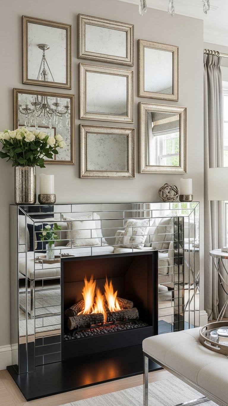 Frame the hearth with reflective tilework for modern sparkle or mix antique mirrorframes for boho charm.