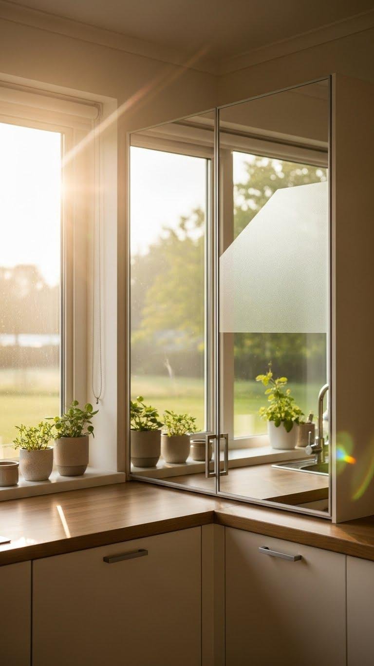 When you place mirrored cabinet doors next to a window, they double the incoming daylight and visually extend the view, turning a modest kitchen into a brighter, airier room.