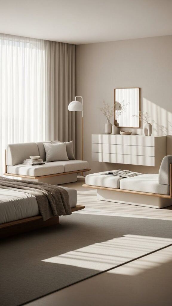You’ll pick pieces that breathe: low beds, slim profile nightstands and streamlined seating that skim the floor. Floating dressers free visual weight, letting light and movement dominate.