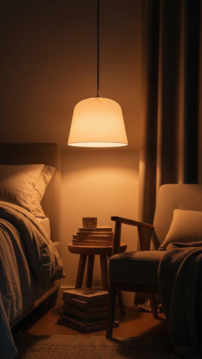 Set warm, dimmable lighting (around 2700K) to make your bedroom feel instantly inviting and lived-in. Choose a soft pendant over a reading nook and add amber dimmers so you control mood and energy. The glow should be cozy, skin-flattering, and low-key stylish. You’ll relax quicker, sleep easier, and keep your neutral space airy yet intimate.