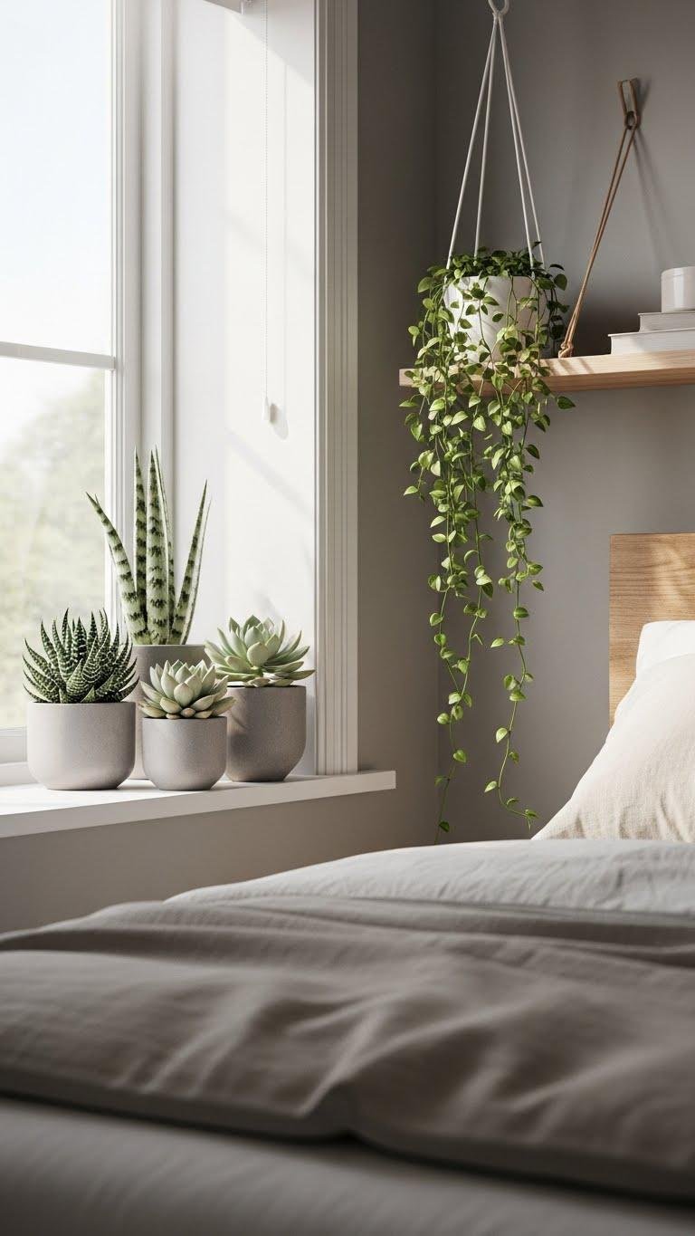 Bring in a few low-maintenance plants to soften the room and freshen the air without upending your calm palette. You’ll love air purifying succulents on a windowsill and a low light pothos trailing from a shelf.