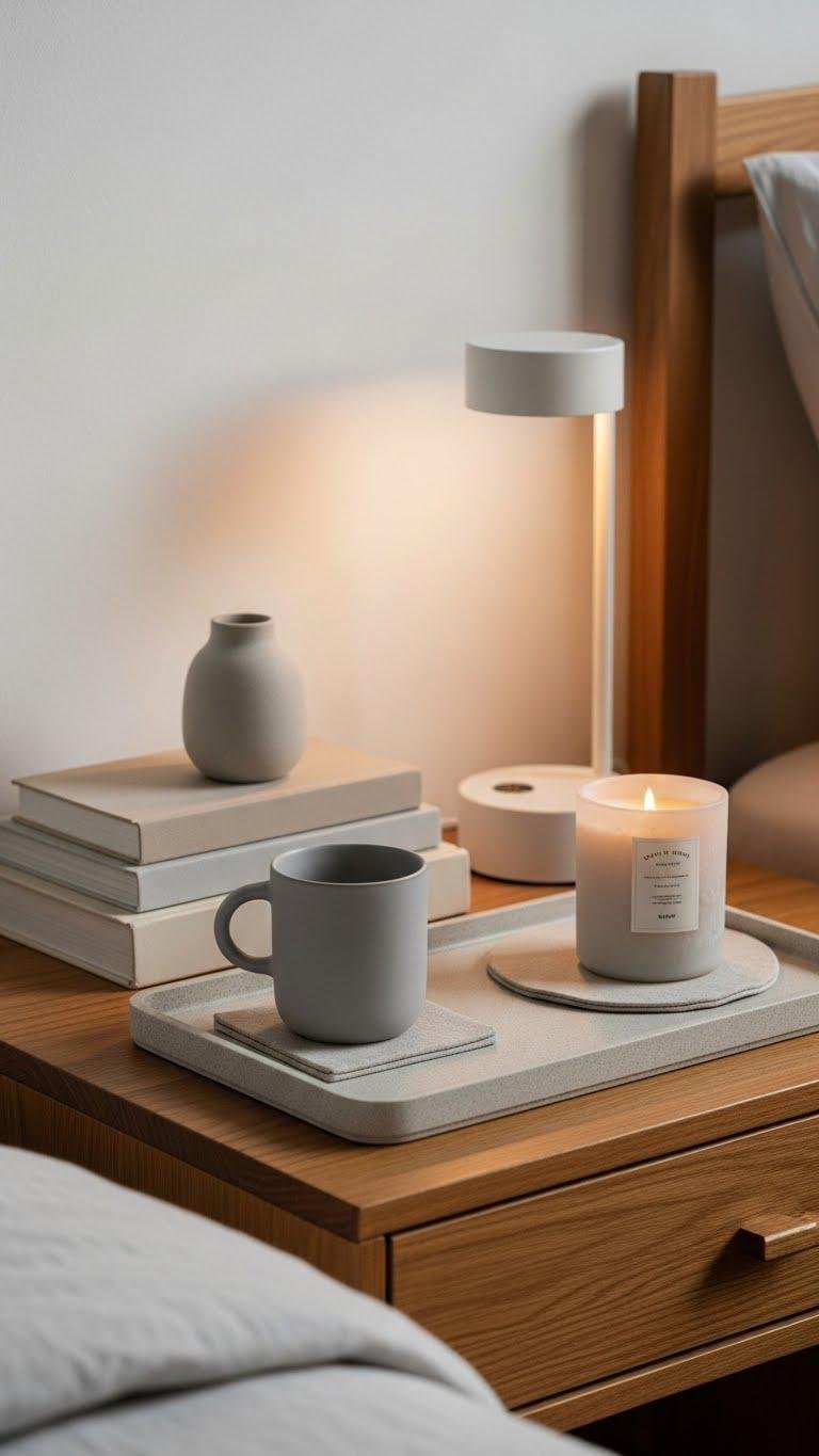 Tuck a low-profile tray on your nightstand to corral essentials and instantly calm the surface—your lamp, a small book, and a ceramic cup read neater together than scattered items.