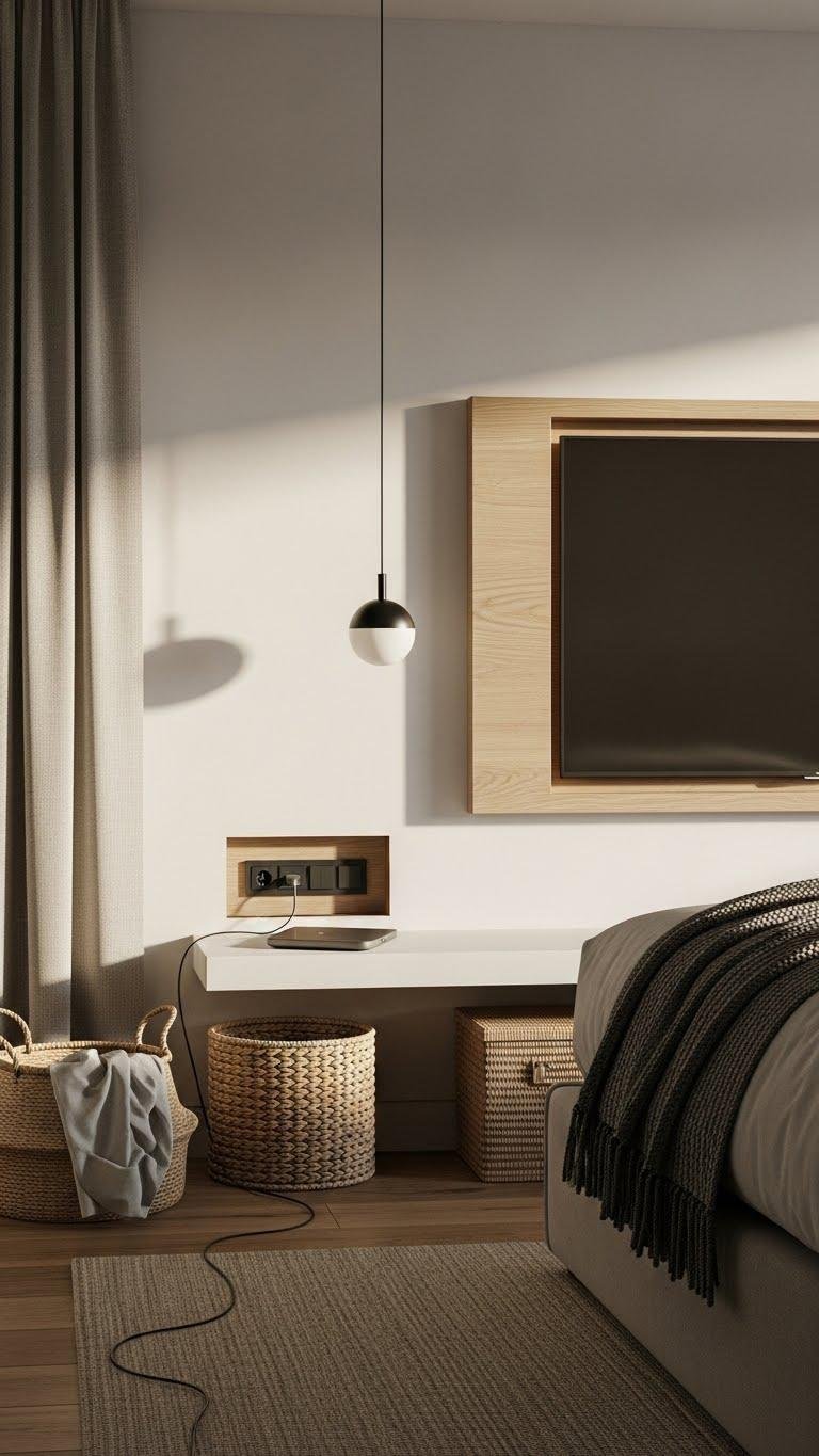 Tuck cords into woven baskets, mount TVs flush, and install hidden docks for chargers.