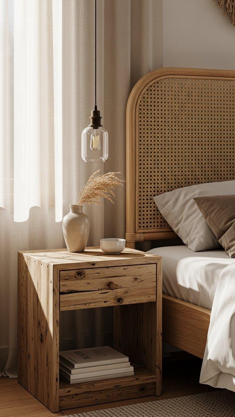 Choose a handcrafted rattan headboard or pendant; its grain and weave add breathability.