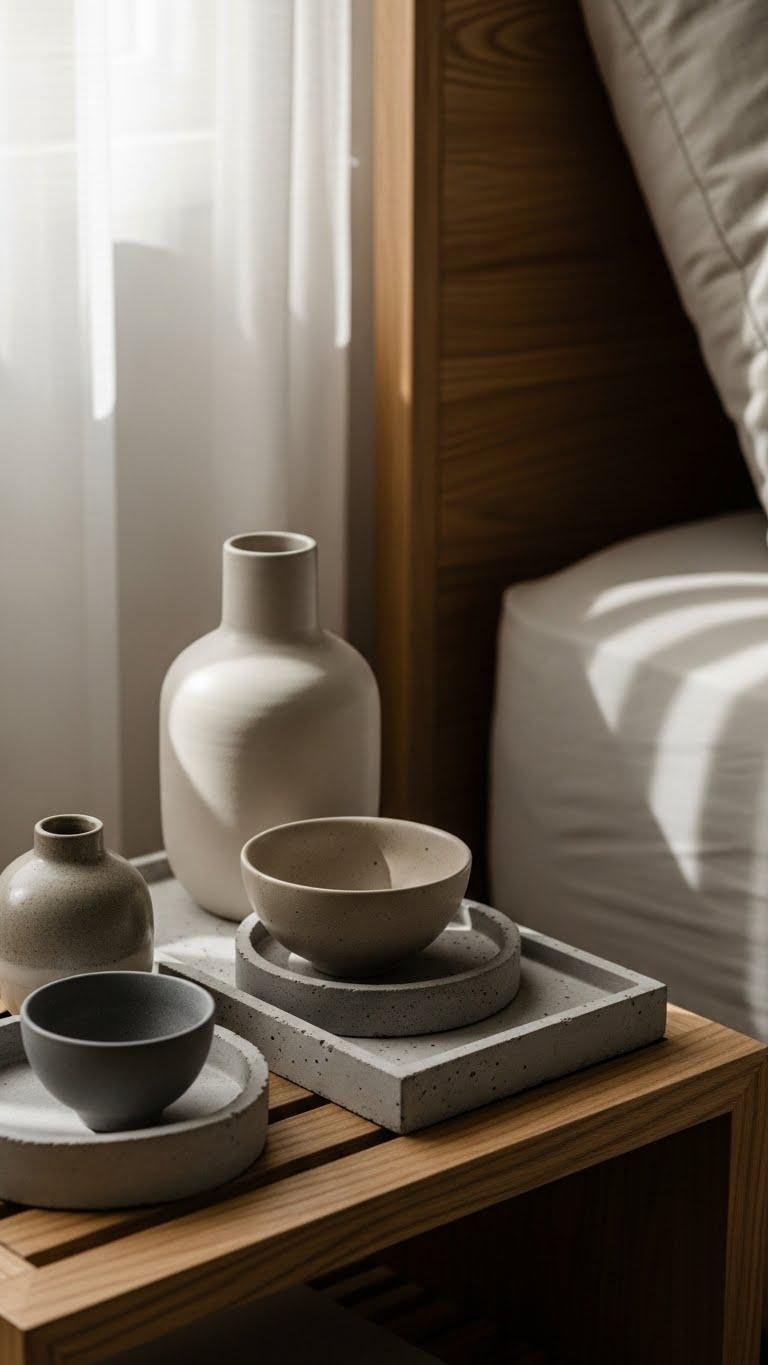 Introduce matte ceramics and concrete accessories to add grounded, tactile contrast to your neutral bedroom. You’ll pair handmade stoneware vases and bowls with weathered cement trays to create calm, modern layers.