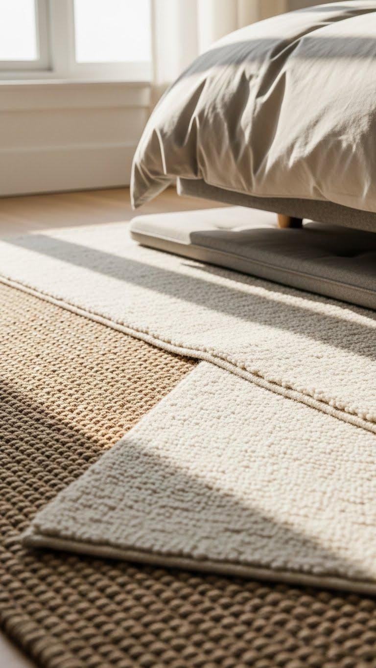 For a cozier, quieter bedroom, layer rugs to add warmth underfoot and soften sound without sacrificing style. You’ll mix textures—jute base, plush wool topper—anchoring the bed, creating wander-ready comfort.