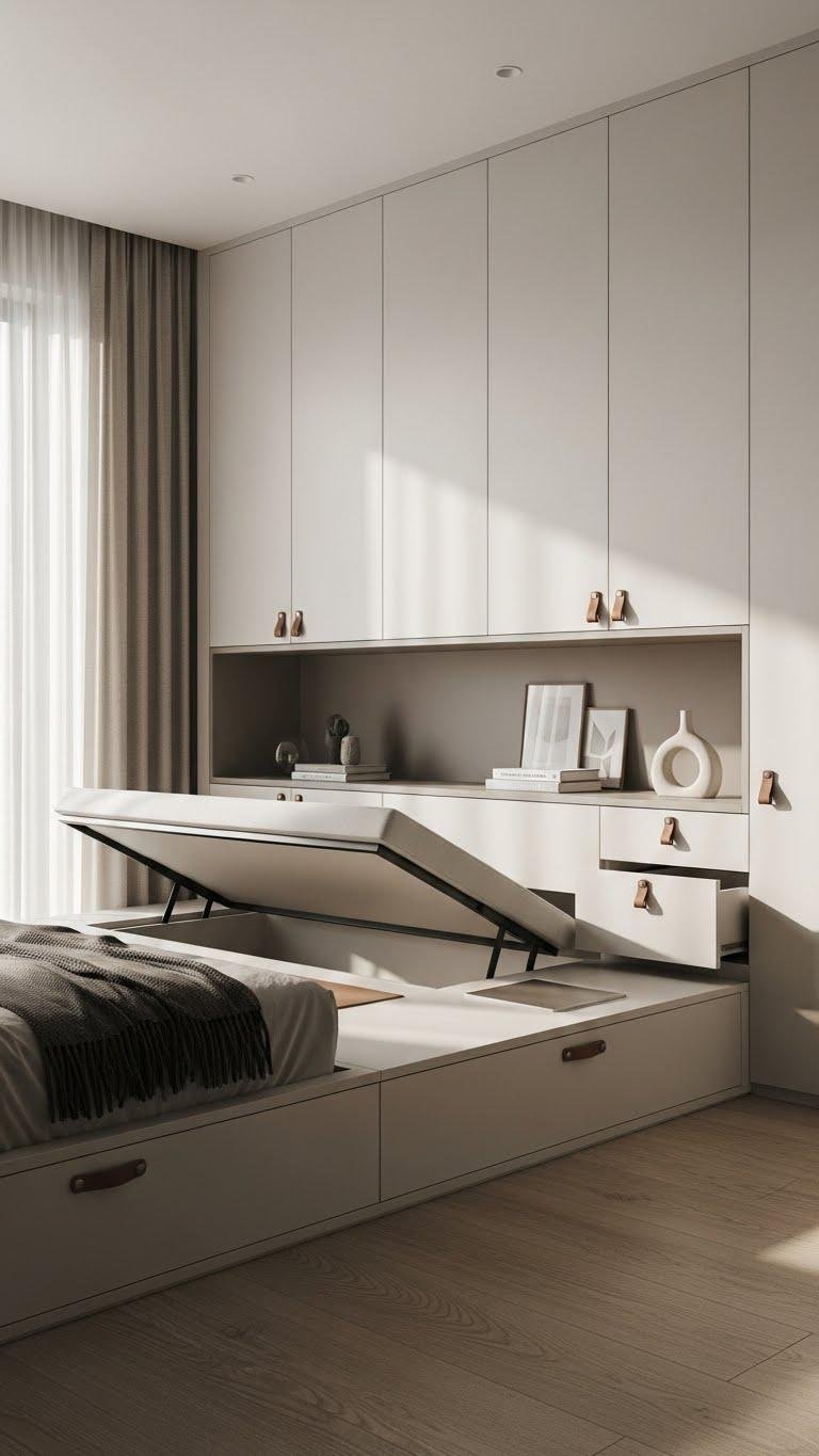 You’ll love hidden drawers and lift storage that vanish into silhouettes, freeing floor space and calming the senses. Choose matte finishes and tactile pulls for a modern, airy retreat.