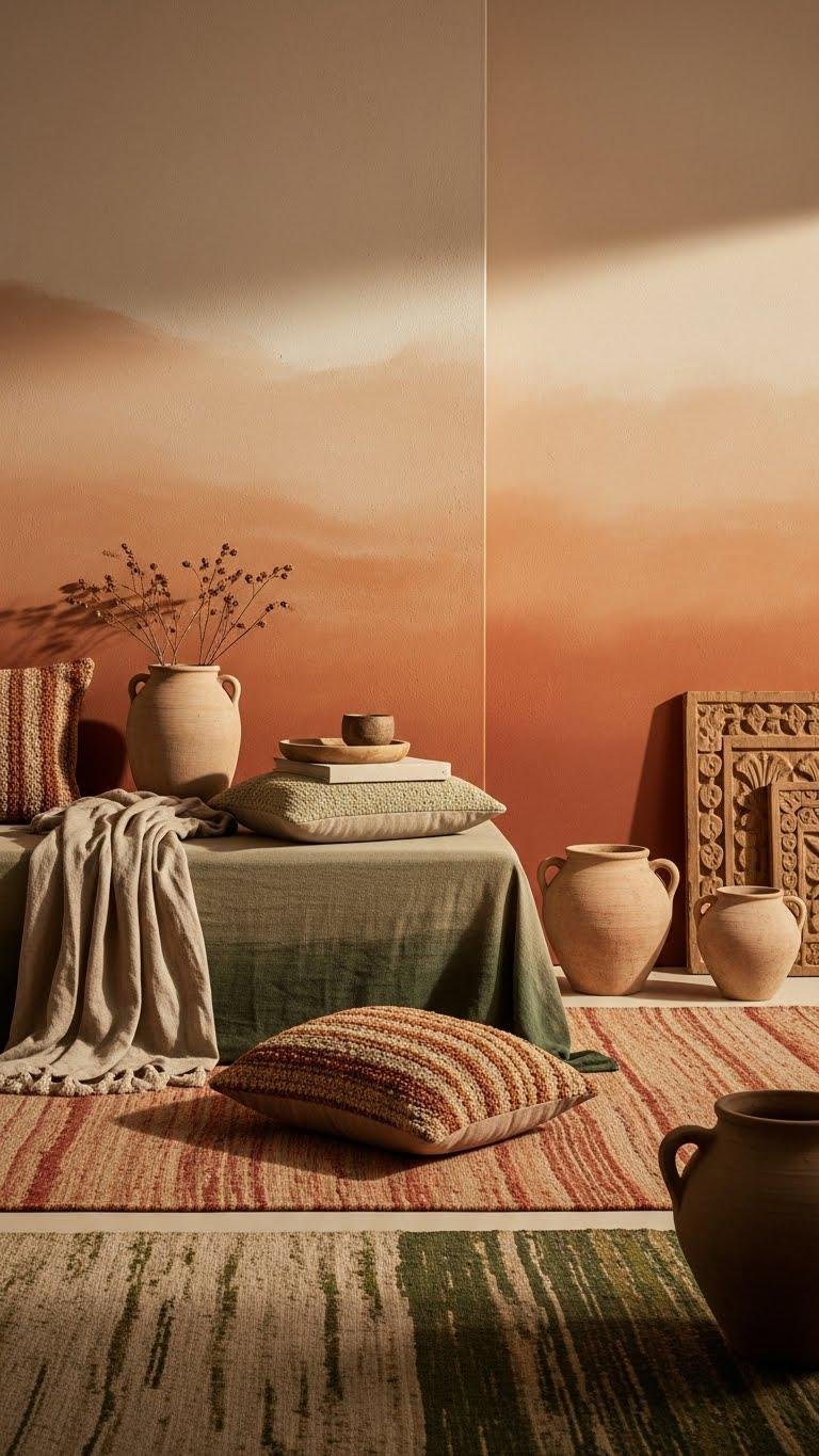 You’ll layer neutrals — sandy beiges, clay, soft moss — to craft an earthy ombre that guides the eye and soothes the mind. Choose tactile fabrics and sculptural accents; you’ll gain a liberated, uncluttered space that still reads rich and intentional.