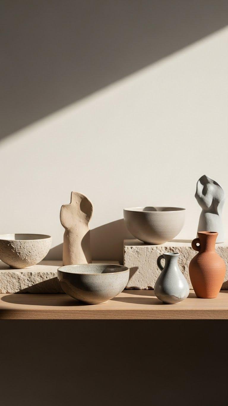 Keep the muted mood by punctuating shadowed neutrals with handmade clay and ceramic pieces that feel like quiet exclamation points. You’ll curate freedom in form: earthy bowls, sculpted silhouettes and miniature vases arranged with intent. Embrace textured glazing for subtle depth, matte finishes for calm, and asymmetry for personality. Display sparingly so each piece reads like a deliberate, timeless statement in your serene space.