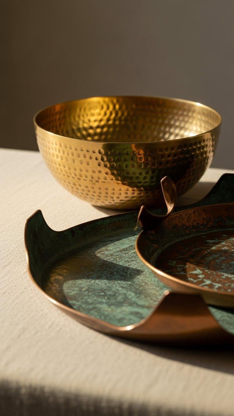 A hammered brass bowl or a patinated copper tray can introduce a warm, tactile counterpoint to neutral textiles and ceramics, and you’ll want pieces that read handcrafted rather than mass-produced.