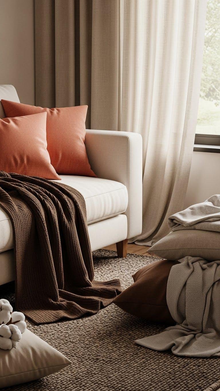 Having set your palette with ivory, coral accents and deep browns, bring the room to life by layering textiles that invite touch and tell a lived-in story. You’ll mix weighty wool rugs, linen drapes and soft cottons, focus on plush throw placement for effortless warmth, and craft textured pillow arrangements that read collected, not staged—letting the space feel free, calm and unapologetically yours.
