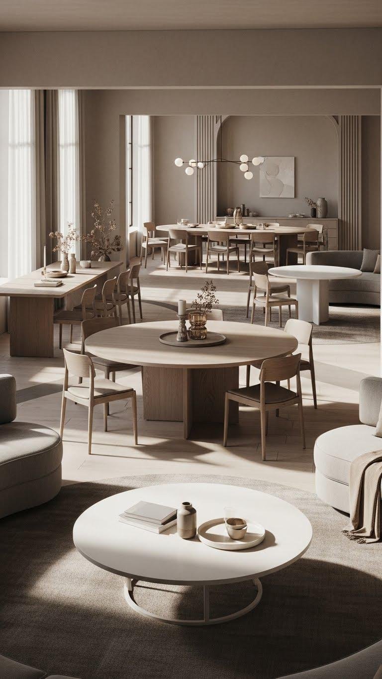 Because curved lines naturally guide movement, round tables bring a soft, timeless flow to neutral rooms and make traffic feel effortless.