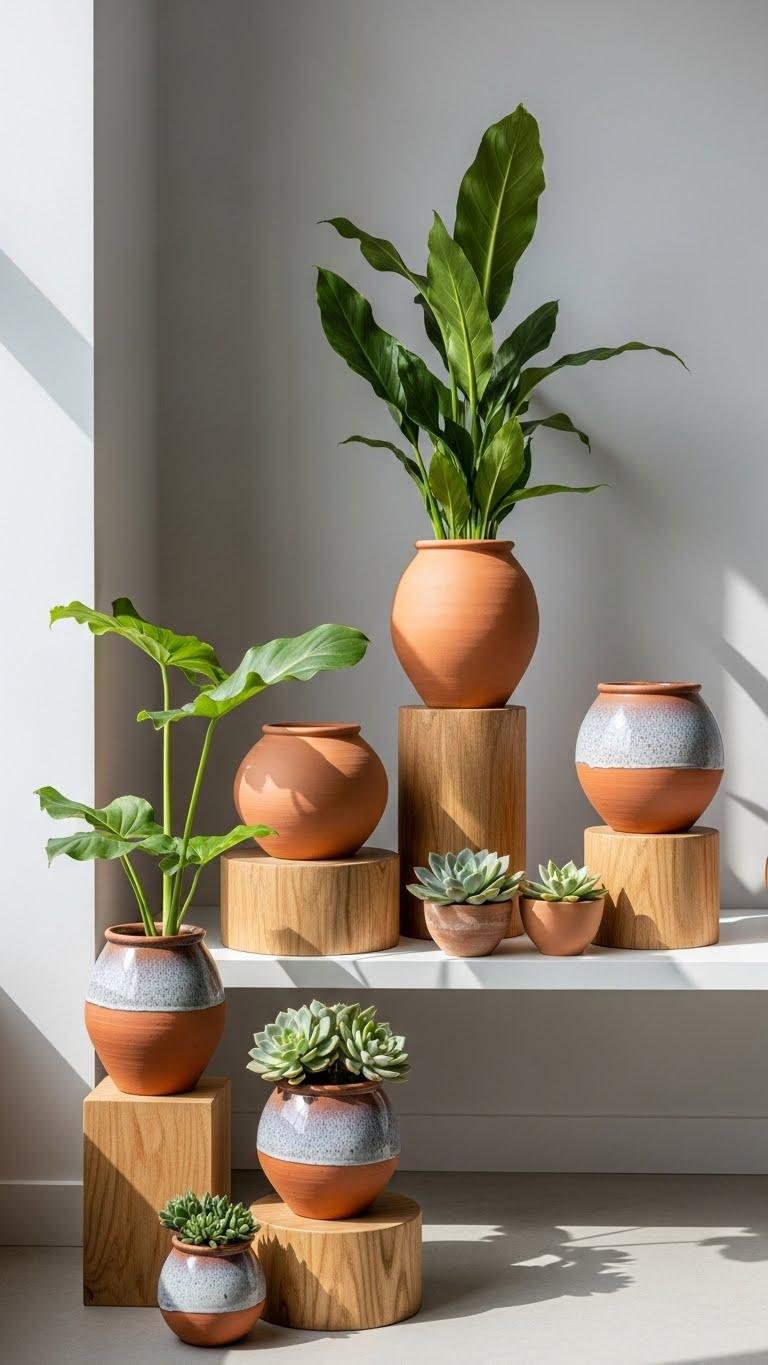 You’ll layer sculptural foliage and petite succulent groupings for texture and low-maintenance appeal, mixing raw terracotta with a few glazed potting accents to catch light. Choose varied heights, embrace negative space, and let plants breathe — freedom in a calm, timeless palette.