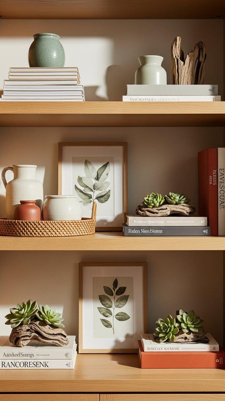 Arrange driftwood vignettes beside stacked paperbacks, mix pottery, woven trays, and framed botanicals. Add succulent stacks for low-effort greenery.