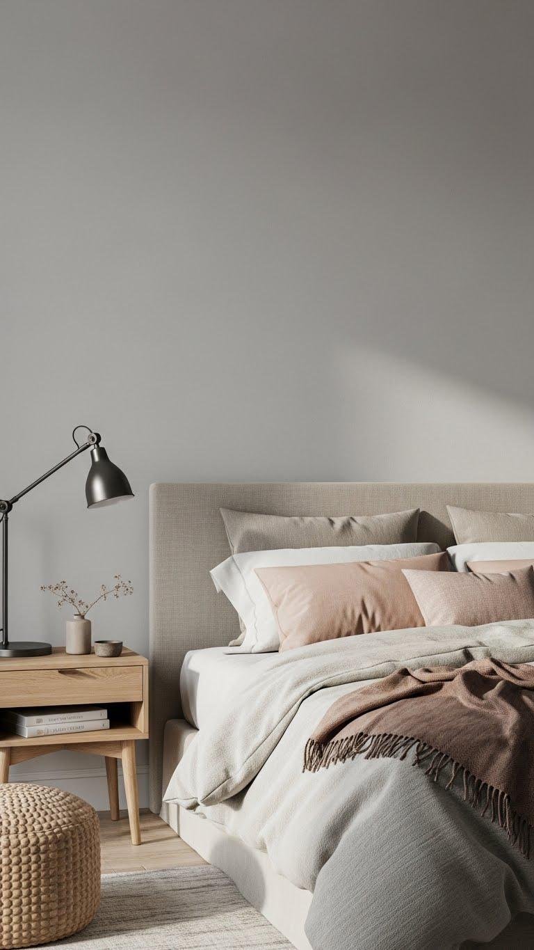 Choose a dominant soft gray for walls, add textured linens and a muted blush accent, then mix natural wood and matte metals so your space feels calm, curated, and effortlessly free.