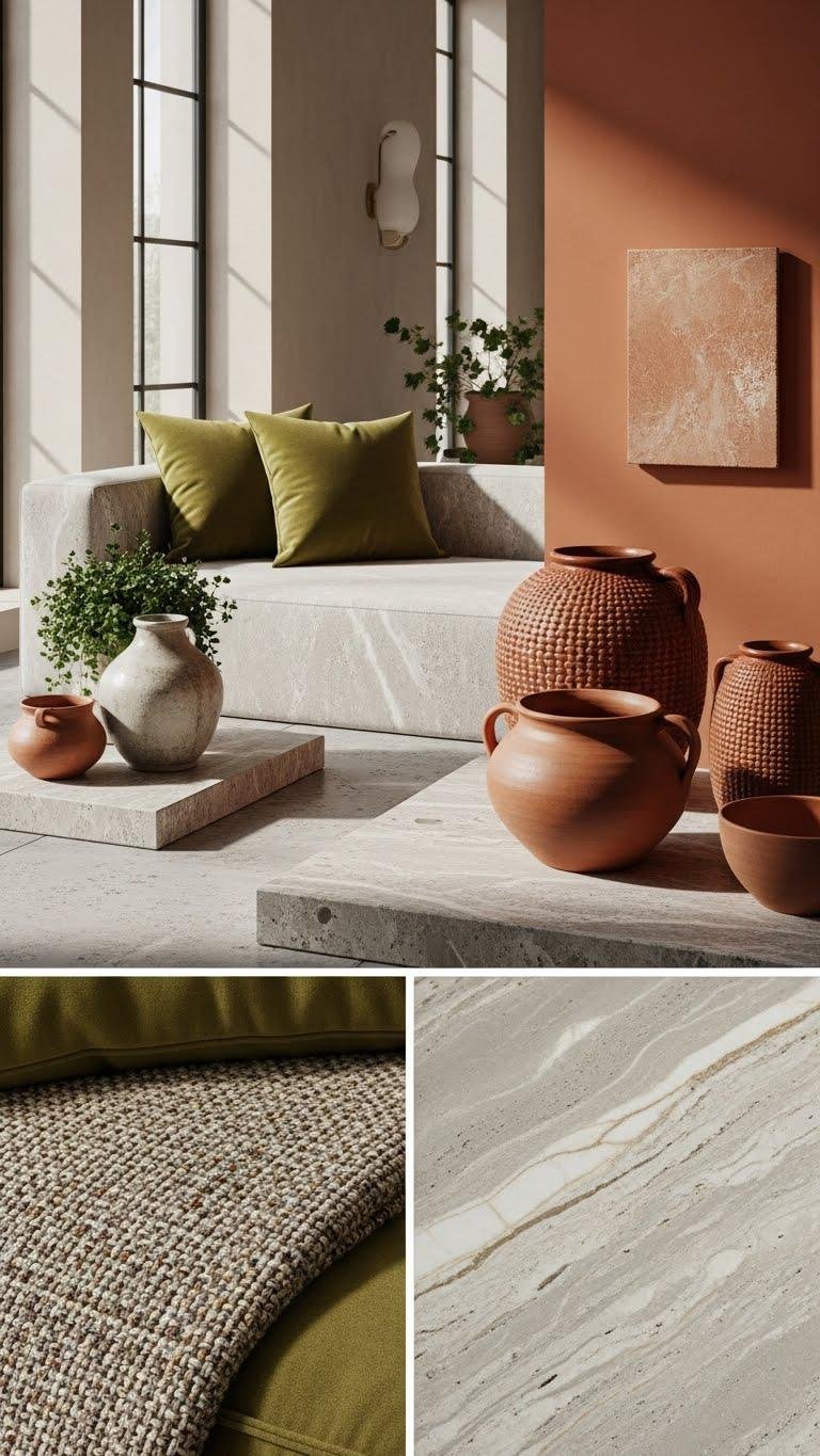 When you introduce olive and burnt sienna into a neutral, stone-forward palette, they bring an earthy warmth that feels both contemporary and rooted—olive adds a subdued, verdant depth while burnt sienna offers terracotta warmth that enhances the tactile quality of marble, concrete, and limestone. Use olive accents and burnt sienna in art, pottery, and textiles to ground spaces, evoke freedom, and keep the look modern yet lived-in.