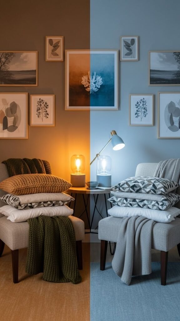 Swap textiles, introduce seasonal lighting for warmth or crisp clarity, and rotate artwork to reflect mood shifts.