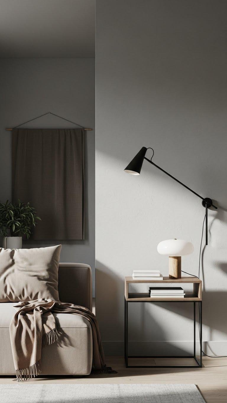 You’ll choose a soft gray wall, pair muted taupe textiles, and keep finishes matte. This lets light, movement, and purposeful objects command attention.
