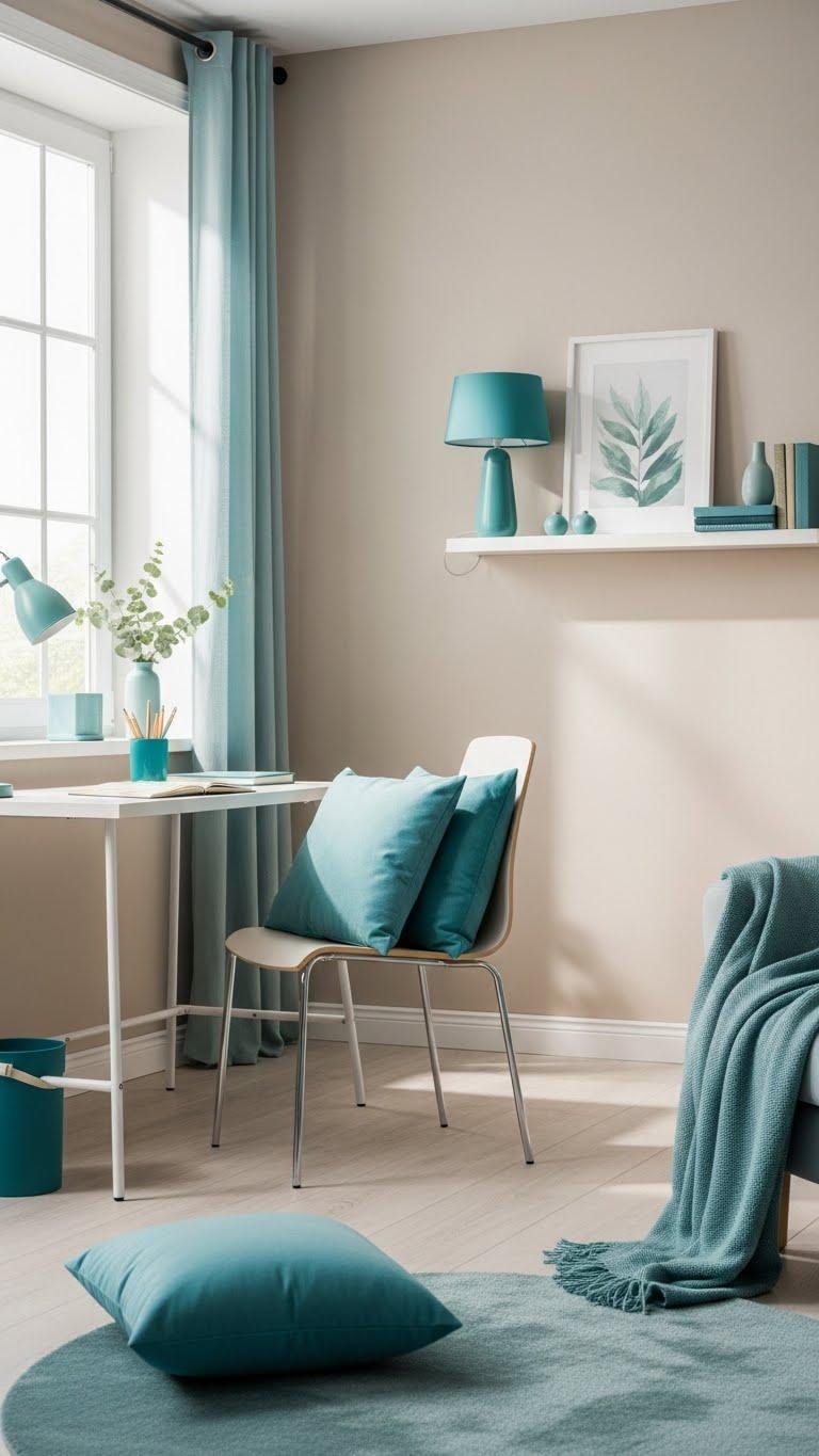 Add teal accents in cushions, a lamp, or a framed print to ground the space. Layer seafoam textiles on a chair or rug for softness. You’ll keep the room airy, intentional, and conducive to steady, liberated work.