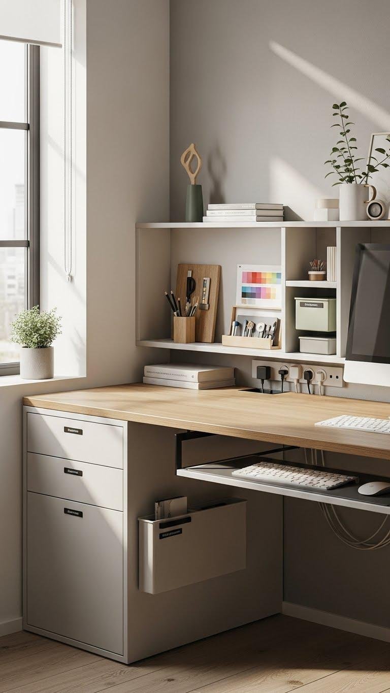 Choose hidden drawers for papers, recessed shelving to showcase curated tools, and under desk trays for peripherals. Route chargers through discreet cable channels and label compartments. You’ll maintain visual calm, streamline tasks, and preserve the open, liberated feeling that makes your workspace both functional and freeing.