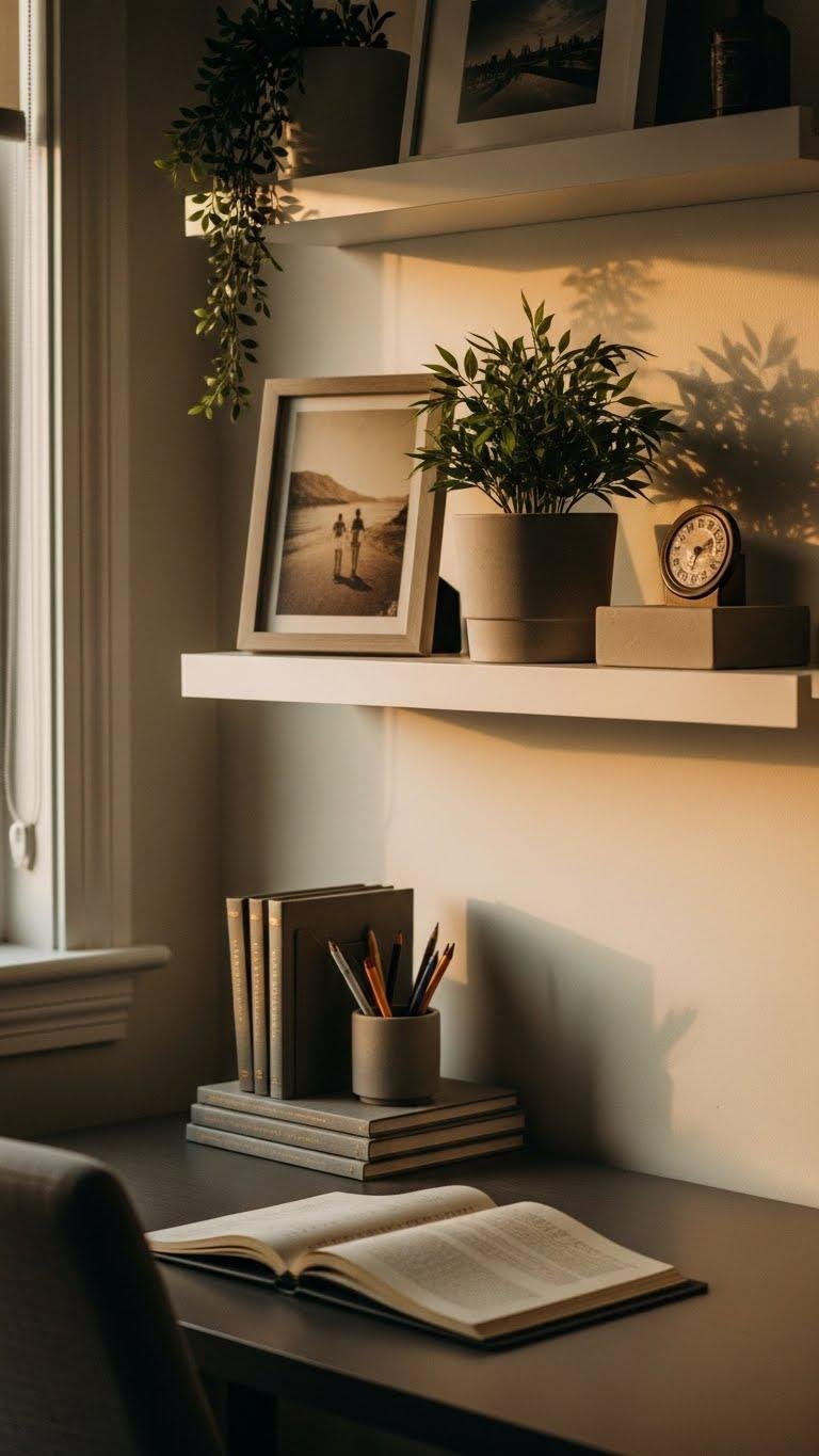 When you place a few carefully chosen photos and treasured objects within sight, they quietly anchor your space and remind you why you work. Curate memory shelves with breathable spacing: a faded travel print, a small plant, a compact heirloom display piece. Rotate items seasonally, keep frames clean, and arrange heights deliberately so your desk feels personal without clutter, freeing focus and calm.