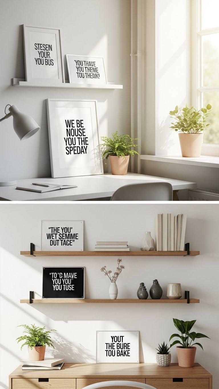 Choose motivational artwork or affirmation signs that feel personal and simple, then place them where you’ll actually see them—above your desk, beside a window, or at eye level on a shelving vignette. Pick framed typographic prints or minimalist metal quoteplates to keep lines clean. Rotate messages seasonally, align pieces with natural light, and let each statement anchor your focus without cluttering the space.
