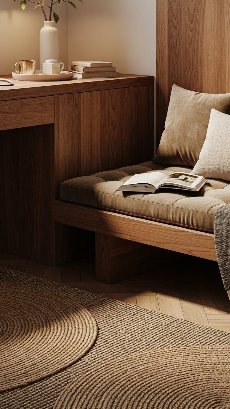 Choose warm timber finishes, pair a low-profile sofa or bench with plush velvet cushions, and layer a natural-fiber rug. These tactile choices keep you centered, encourage relaxed focus, and let your space feel free, intentional, and inviting.