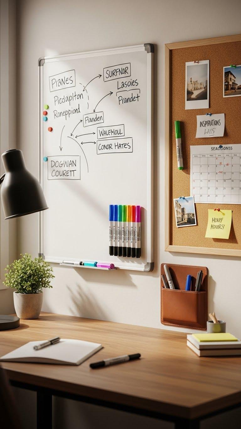 Pin up a whiteboard or corkboard within arm’s reach of your desk so ideas land where you can act on them—use the whiteboard for fast sketches and evolving plans, and the corkboard for pinned inspirations, deadlines, and tactile reminders. Keep a magnetic marker hub for tidy tools and a portable brainstorming pocket for notes you carry; this setup lets you riff freely and stay organized.