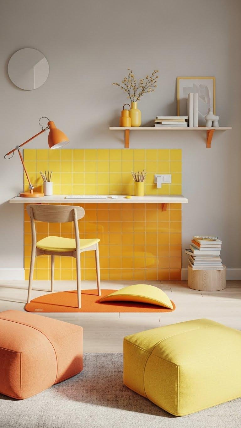 Brighten things up with strategic pops of yellow or orange that energize without overwhelming the room. You’ll place sunny accent tiles as a focal backsplash or desk half-mat, pairing them with citrus fabric poufs for flexible seating. Choose muted walls and natural wood to let highlights sing, limit the palette to two warm tones, and rotate small accessories to keep your workspace liberated and lively.