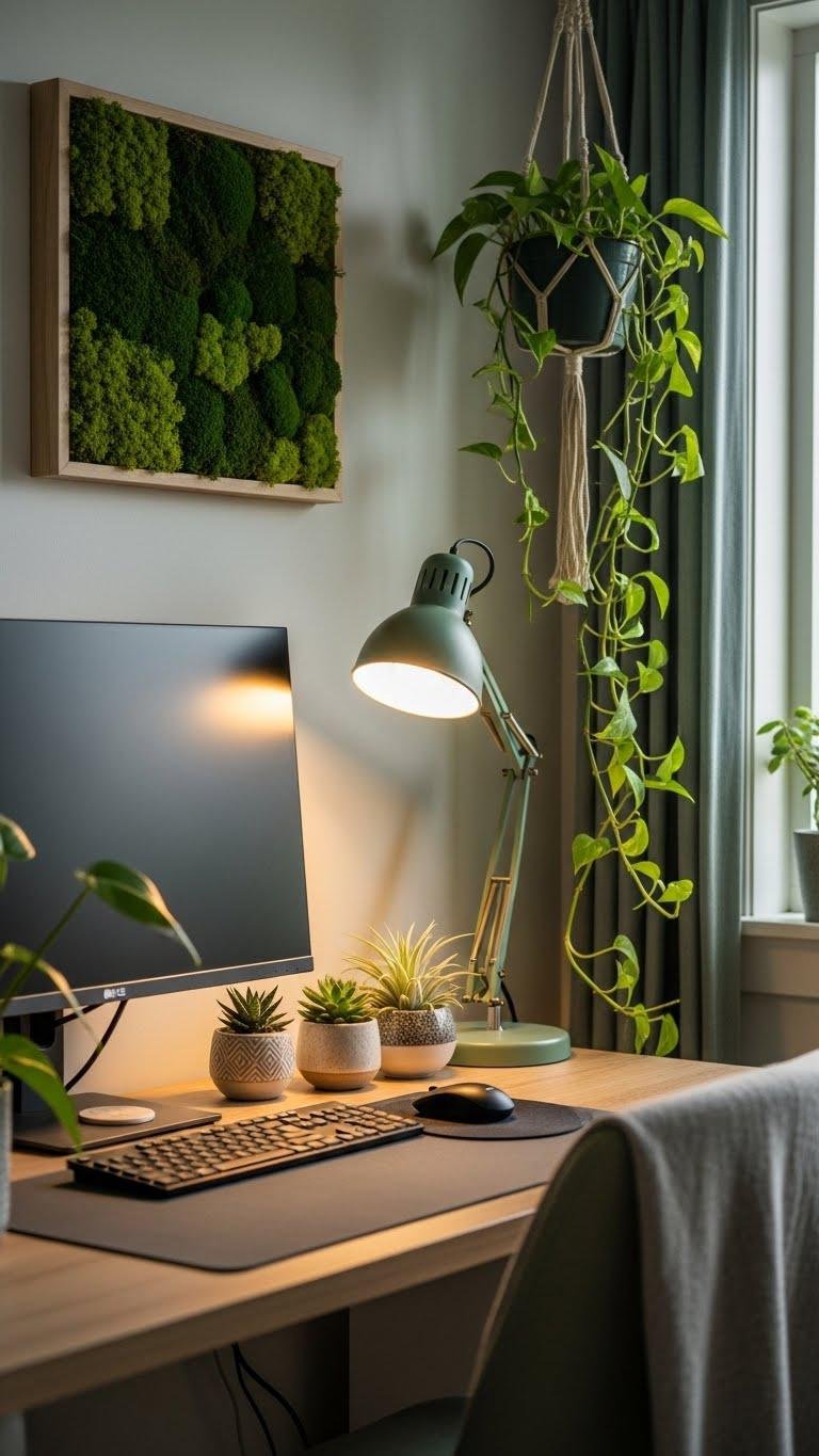 Good task lighting keeps your eyes comfortable and your focus sharp, and adding live plants brings a complementary kind of clarity — one that calms the mind and refreshes the air. Place air purifying succulents near your desk, train a trailing pothos for visual softness, and mount moss wall art to anchor the space. You’ll breathe easier and work with clearer intent.