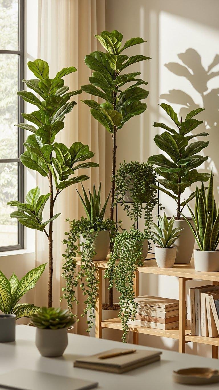 When real plants aren’t practical, bring in high‑quality artificial greenery to keep the room feeling fresh and alive.
