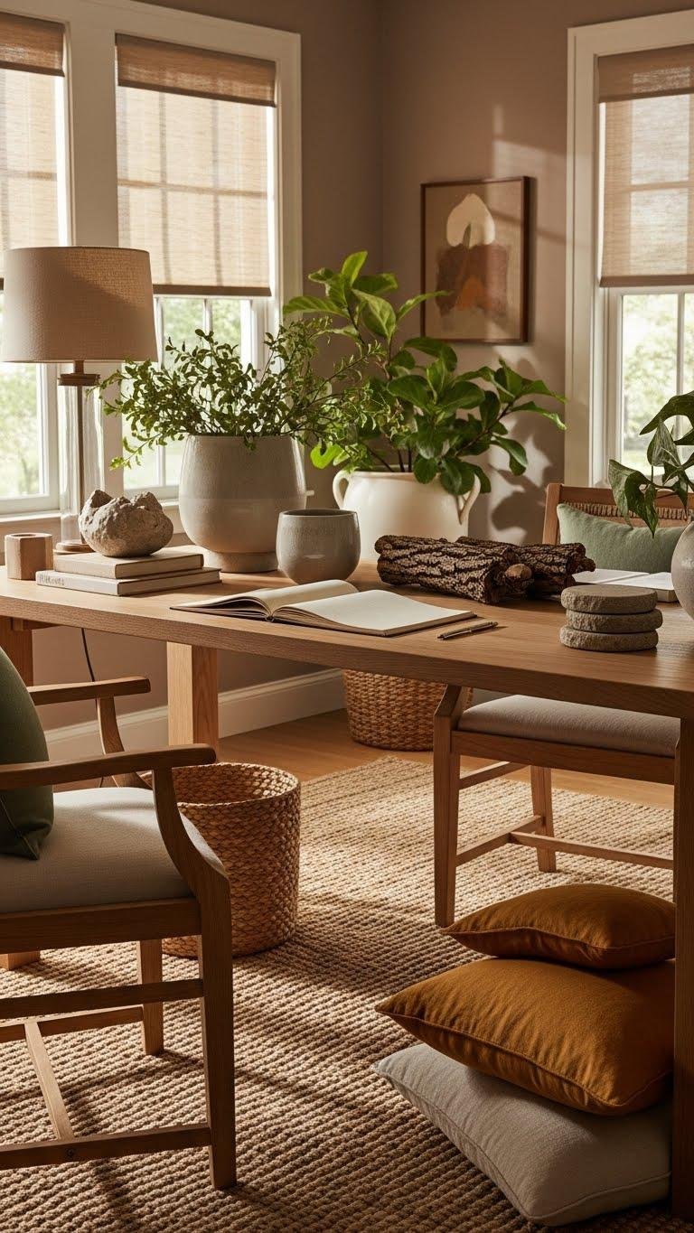 Bring tactile nature into your home office with biophilic materials that balance warmth and function; think raw oak desktops, woven jute rugs, matte ceramic planters, and soft linen window shades that invite touch and tone down glare.