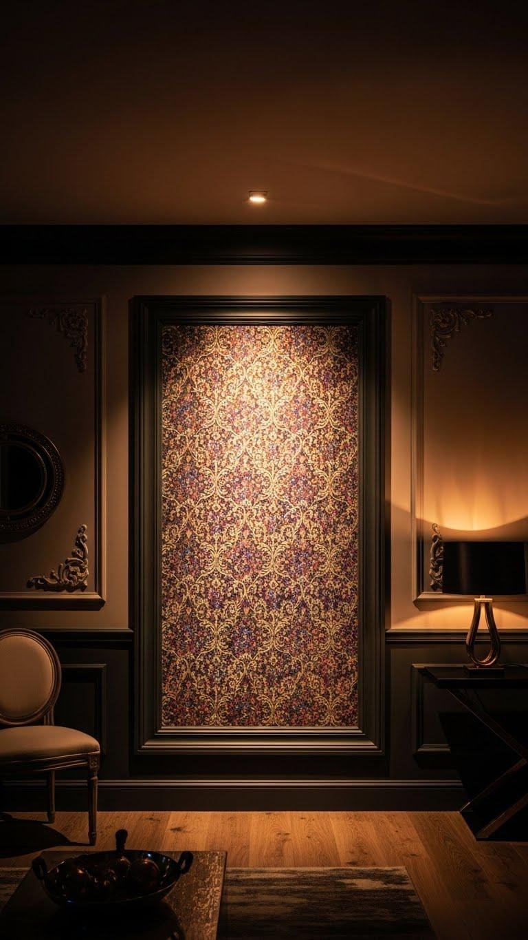 After grounding the room with darker trim or a low, matte ceiling, you can make a bolder personal statement with a single accent wall that carries pattern or texture—this is where personality meets architecture. Choose ornate stenciling for artisanal drama or levitating wallpaper for a modern, weightless effect. You’ll create an intimate focal point that feels liberated, intentional, and utterly you.