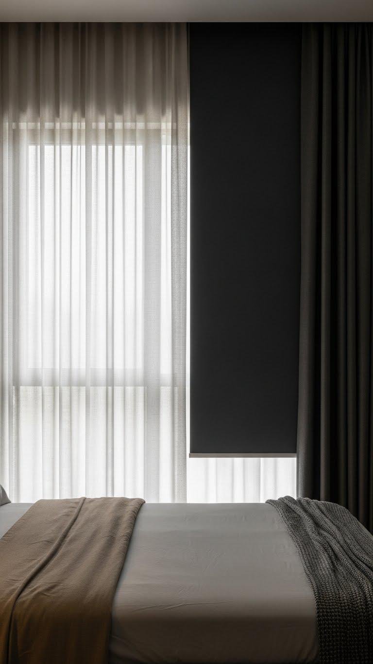 When you layer floor-to-ceiling sheers with blackout panels, you get control and atmosphere in one clean move: the diaphanous sheers soften daylight and blur edges, while the heavy blackouts guarantee true darkness and thermal insulation when you need it.
