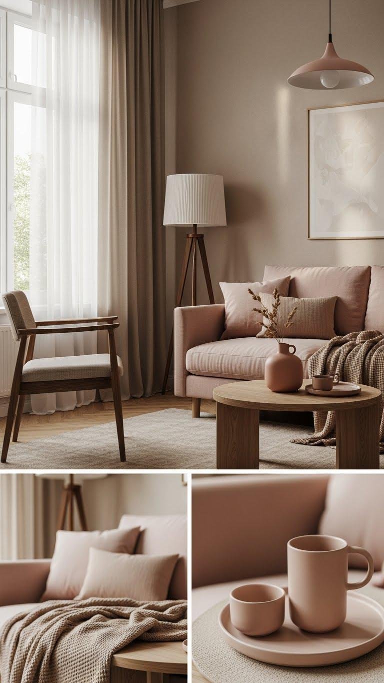 Start with a soft blush as your anchor and layer warm neutrals around it to create a room that feels intimate without being fussy.