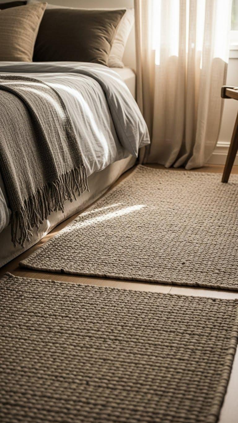 After you’ve layered cooling bamboo sheets and lush velvet shams, bring that same tactile invitation down to the floor with a thick, tactile area rug that anchors the room and asks you to stay a while. Choose handwoven textures and neutral tones, then mix in high pile runners for warmth underfoot. You’ll create a free, intimate sanctuary that welcomes lingering.