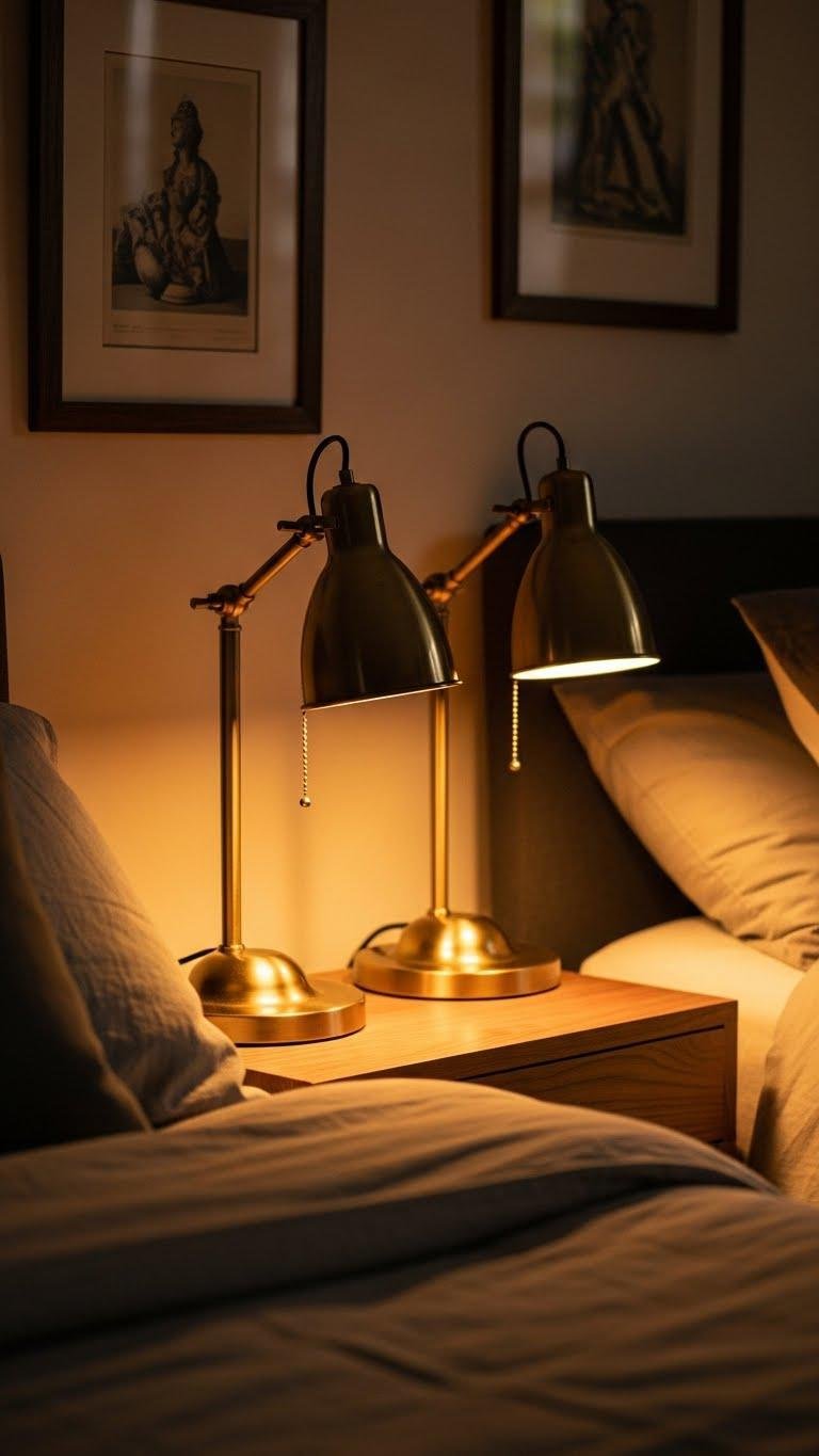 Settling a pair of brass or antique bedside lamps beside your bed instantly gives the room a lived-in, considered glow—warm metal and aged patina temper soft linens and classical prints while providing focused light for reading or winding down. Choose pieces with vintage pull chains and matte finish bases to balance shine and restraint; you’ll create intimate, unfussy lighting that invites lingering and honest rest.