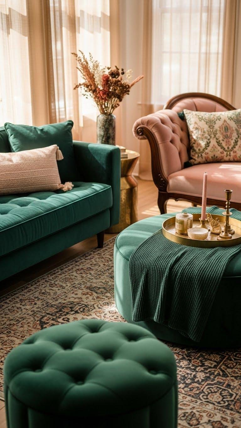 You’ll learn how to make your home feel quietly romantic without fuss—soft blush sofas, jewel‑tone walls, layered linens, and low, golden light that begs you to slow down. Think tactile layers, a shared reading nook, candle clusters on mirrored trays, and subtle botanical touches that look both collected and effortless. Keep going and you’ll find simple swaps that shift the whole mood.