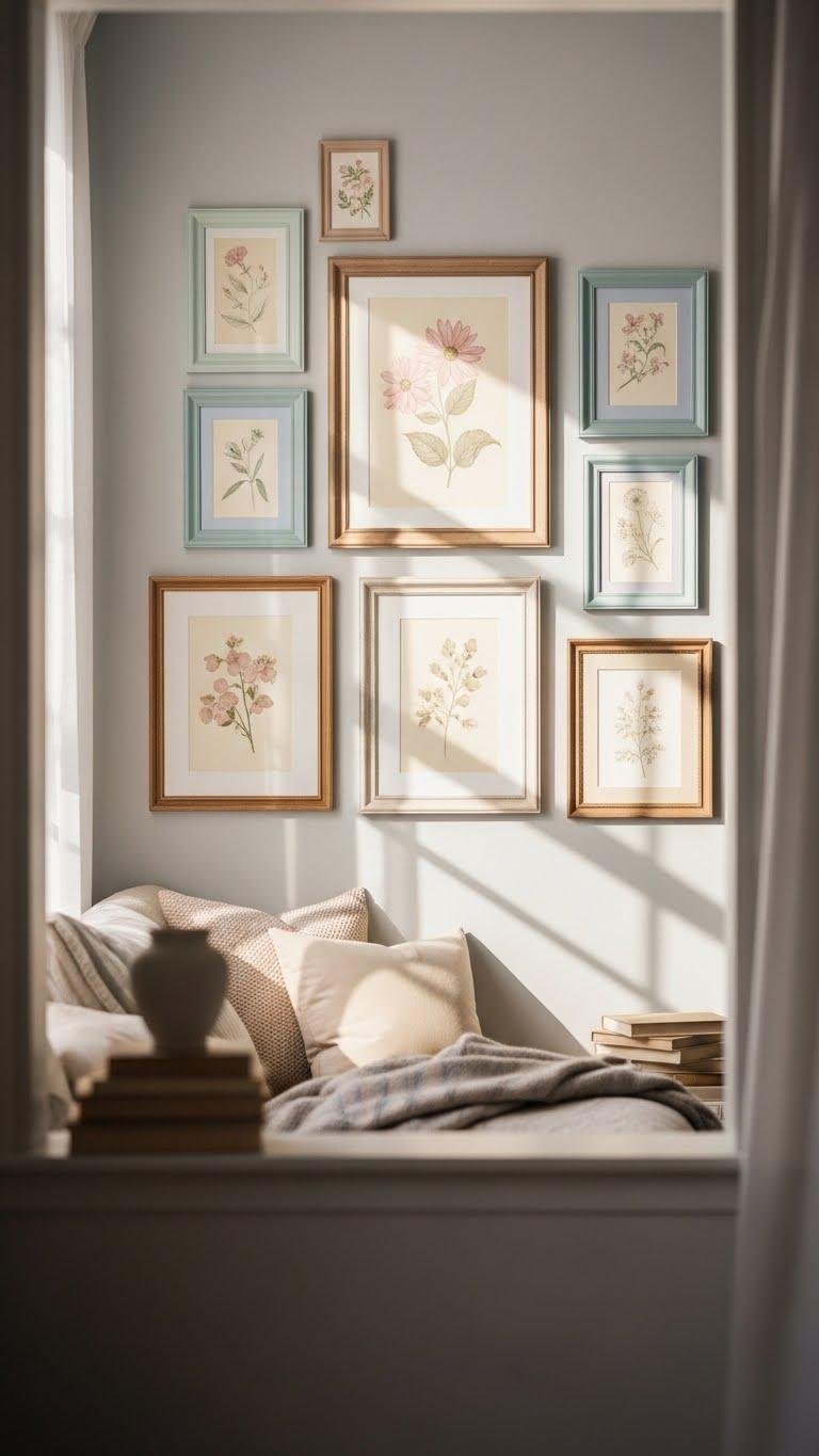 After you’ve carved out that cozy shared reading spot, soften the surrounding walls with a pastel gallery that keeps the room feeling airy and intimate. Choose vintage pastel prints and delicate botanical sketches in mismatched frames to create effortless cohesion. Hang them low, mix scales, and leave breathing room so the collection feels personal, libre, and quietly romantic—an invitation to linger and imagine.
