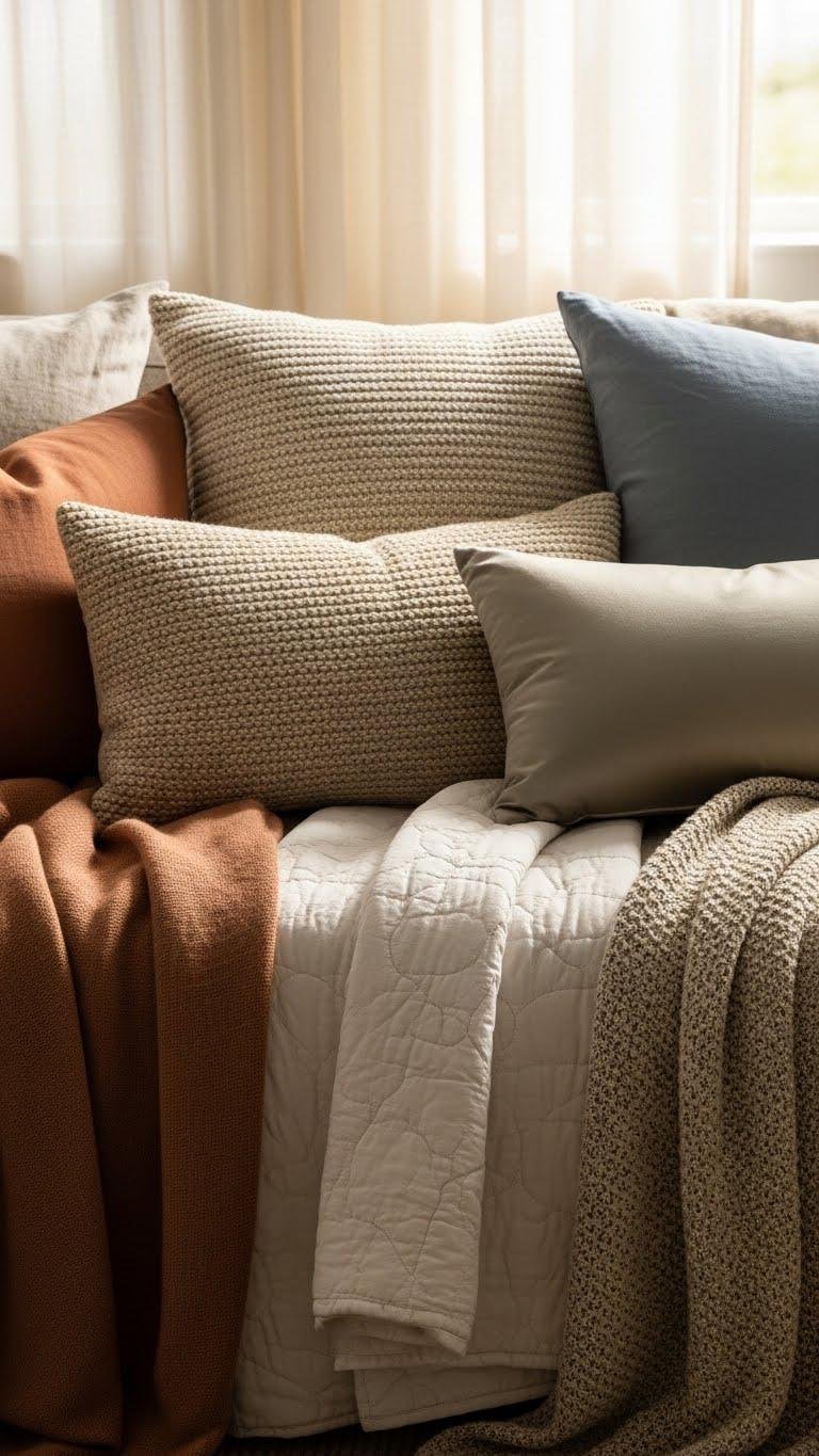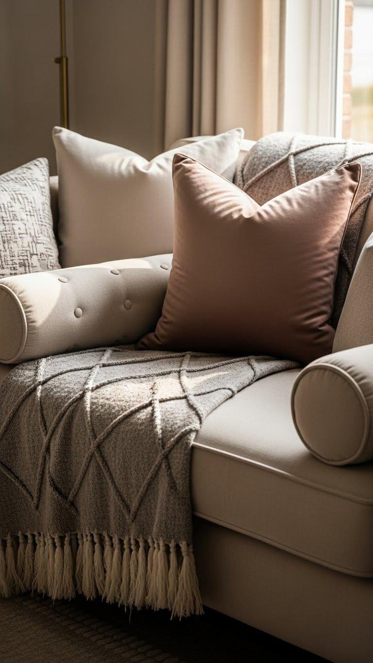 Layer soft throws, lumbar pillows, and a lightweight quilt to give your sofa depth and invite touch; layered textiles make the seat look both curated and lived-in. You’ll mix mismatched fabric confidently—linen, knit, silk—so each piece sings. Embrace seasonal swaps to refresh mood and color, and arrange casually so the space feels free, intimate, and instantly welcoming without fuss.
