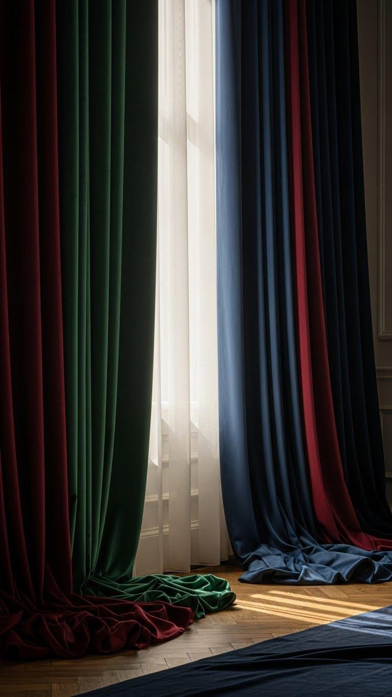 Bring in heavy silk or velvet drapes to anchor the room and dial up the romance—these fabrics drape with a slow, cinematic weight that softens light and sharpens silhouette. You’ll favor heavy drapery for privacy and texture; choose a silk lining to protect fabric and boost flow. Let panels puddle a little, framing windows like a velvet curtain on your life’s private stage.