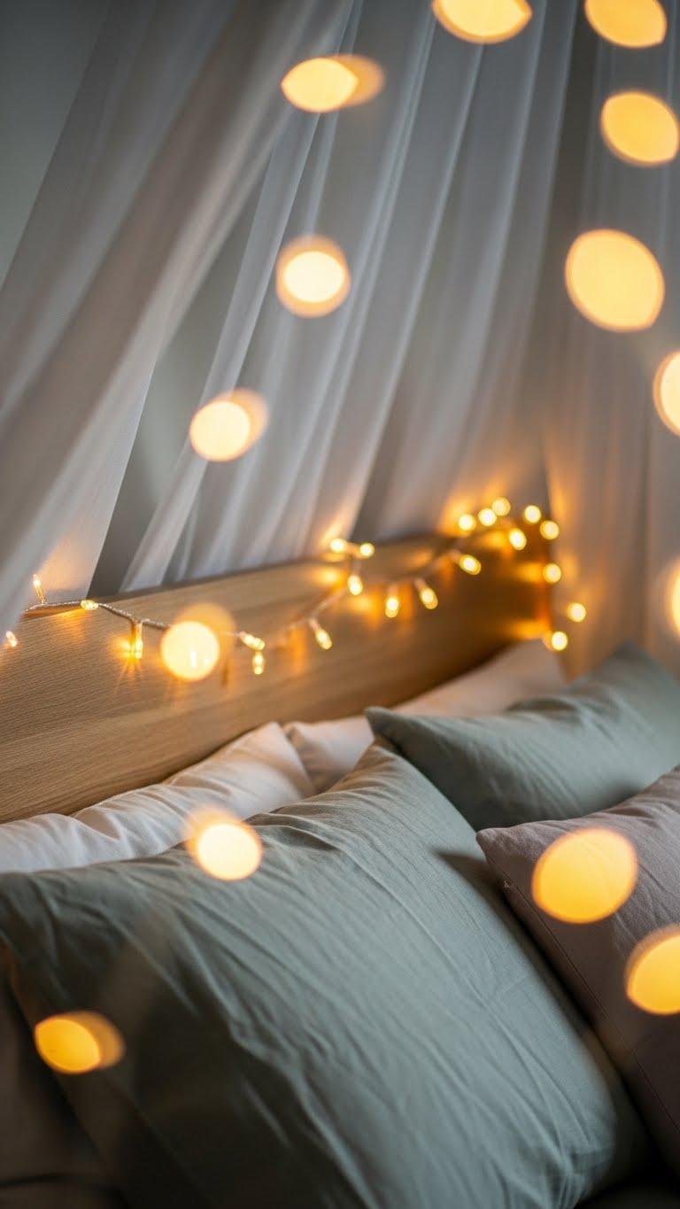 You’ll find string lights over a headboard turn an ordinary bed into a softly lit sanctuary, casting a halo that makes the space feel curated and cozy.