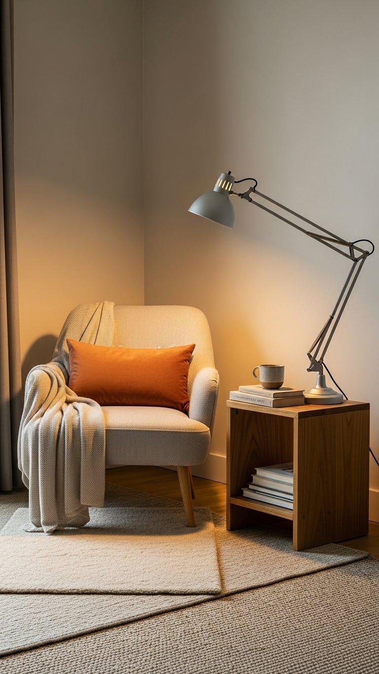 Place an adjustable reading floor lamp beside a chair in your cozy corner, combine a layered rug for texture underfoot, and keep a small side table for books and a mug — freedom to unwind, styled simply.